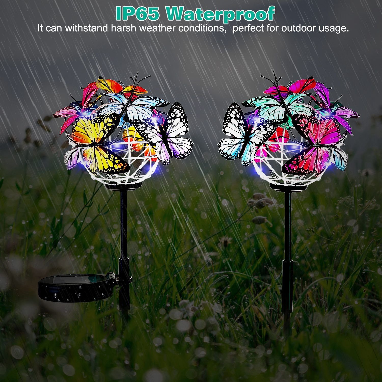 *18 Lifelike Butterflies*:Each light is composed of 9 lifelike butterflies with mixed colors and 16 LED beads. Made of fabric material,the butterflies are durable,not easy to fade,and look like real ones. The 16 LED beads can emit colorful lights at night,making your garden more attractive and wonderful.
